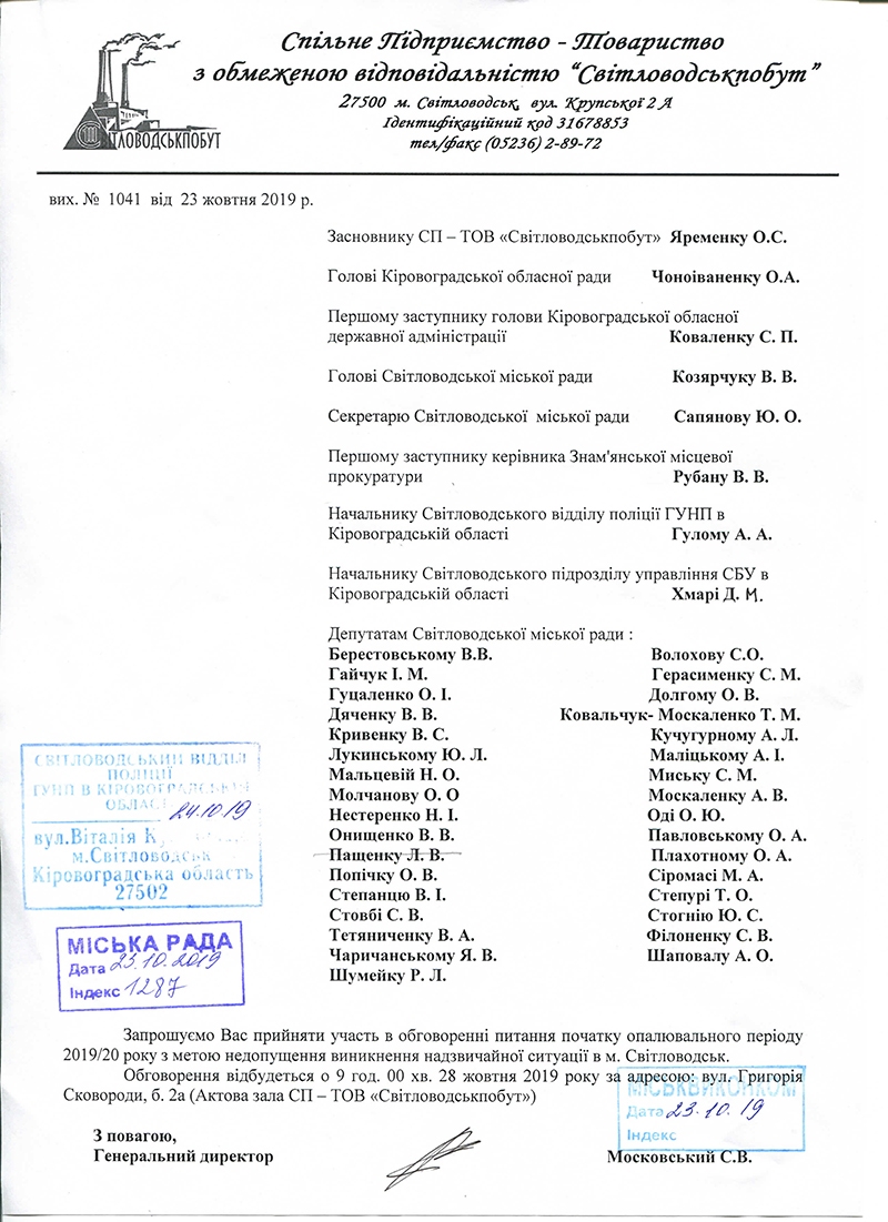 Тому ми звертаємося до голови Кіровоградської обласної ради Чорноіваненка О.А., та вкотре до першого заступника голови Кіровоградської обласної державної адміністрації Коваленка С. П., голови Світловодської міської ради Козярчука В. В., секретаря Світловодської міської ради Сапянова Ю. О., першого заступника керівника Знам'янської місцевої прокуратури Рубана В. В., начальника Світловодського відділу поліції ГУНП в Кіровоградській області Гулого А. А., начальника Світловодського підрозділу управління СБУ в Кіровоградській області Хмари Д. М. та всіх депутатів Світловодської міської ради з пропозицією, взяти участь в обговоренні питання початку опалювального періоду 2019/20 років з метою недопущення виникнення надзвичайної ситуації в м. Світловодськ.